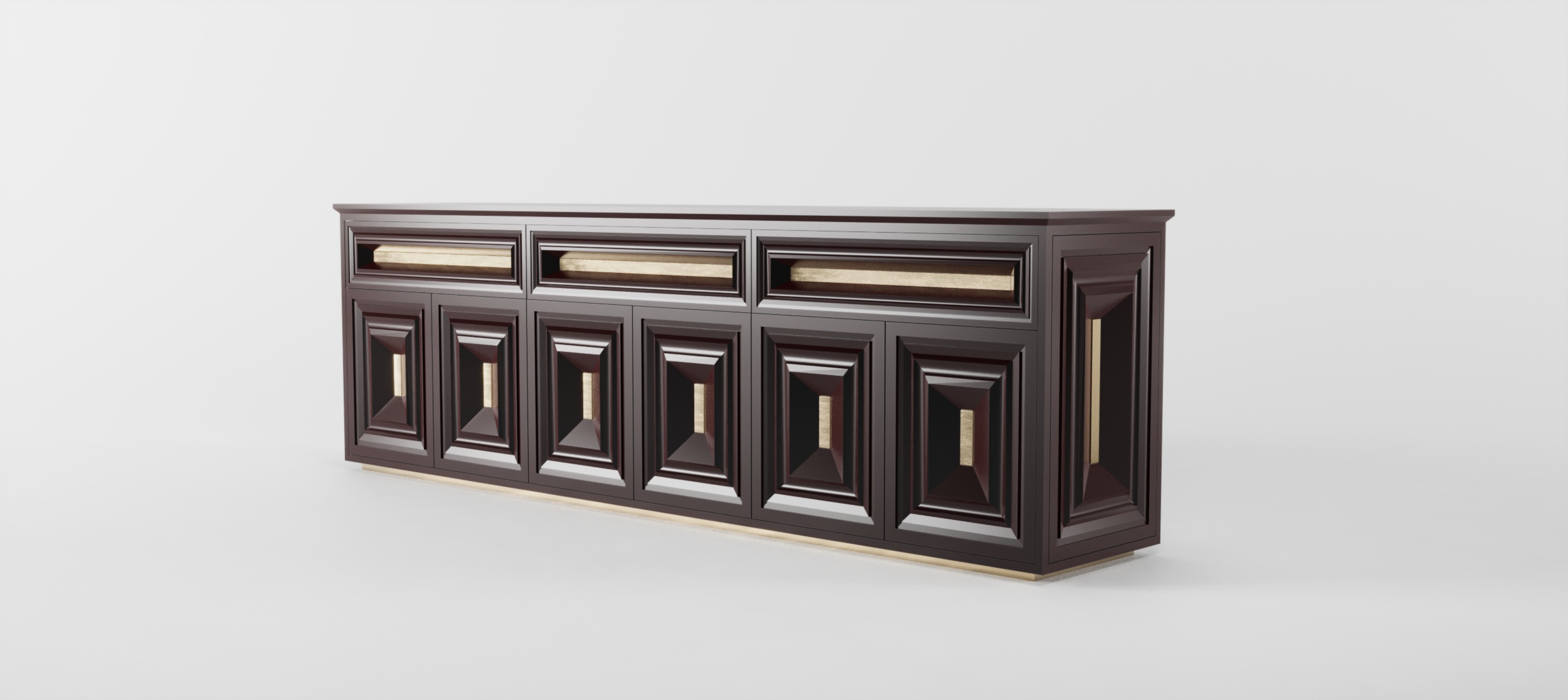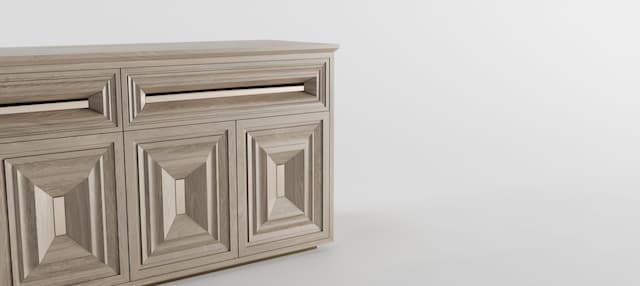 The sideboard exudes a minimalist, modern aesthetic with a design divided into six equal sections, creating a harmonious sense of balance and Eastern symmetry. Each section is thoughtfully crafted to suggest a distinct three-dimensional depth, adding visual intrigue and a sophisticated touch to any space.